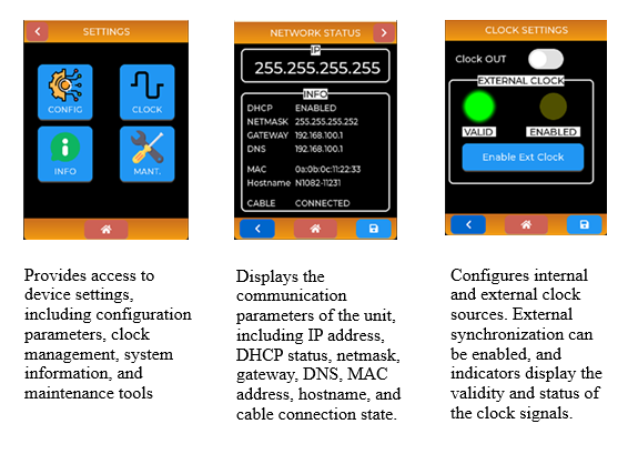 On the touch screen interface, each function is associated to a widget, meant to be used for configuration and monitor purposes.