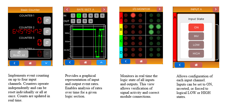 The module is organized in four sections, with 6 inputs and 4 outputs each accepting TTL/NIM signals, with the possibility to feed in analog signals and process them through a leading-edge discriminator. The input stage features an asynchronous Gate&Delay with 5 ns resolution while the output stage feature an asynchronous Monostable stage. This allows the user to trim at best the needed parameters and to perform accurate measurements using the available logic functions.