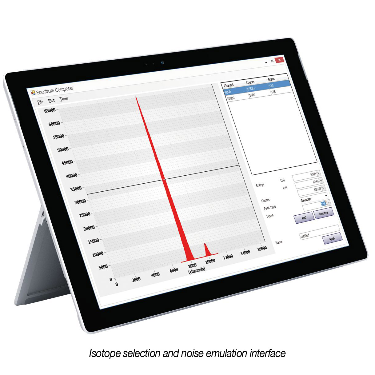 In “Emulation mode” the unit can reproduce signals from a real energy spectrum that can be uploaded in the form of CSV or ANSI N42.42 files. A database of nuclides is provided to generate specific emission lines and Gaussian noise can be added. An user friendly control software is provided with the unit.