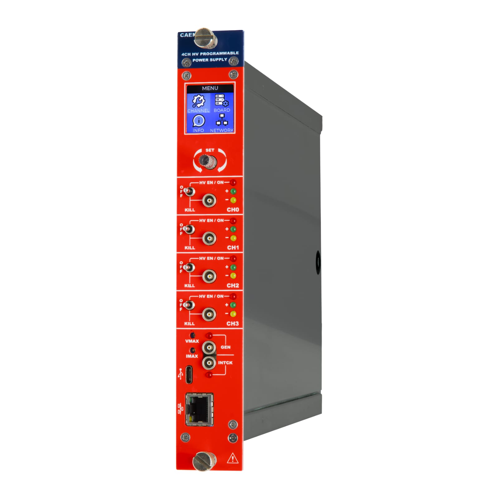Thanks to its ARM-based architecture, the module offers advanced channel management features, including software-controlled polarity reversal. All channels share a common floating return, fully insulated from the crate ground, while high-voltage outputs are available via SHV connectors.