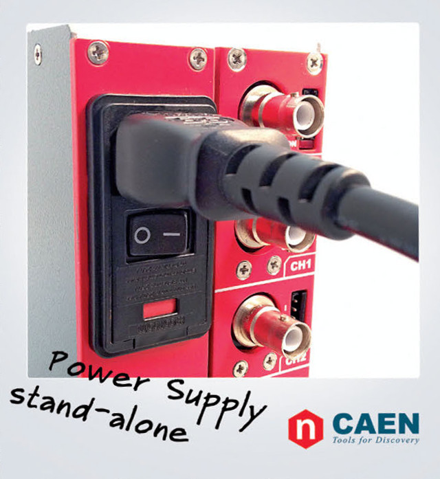The CAEN Mod. NDT1419 provides 4 independent High Voltage channels in a double width NIM mechanics. Desktop operation (110/220V AC Powered, needless a NIM crate) is also supported. Each channel can provide a ±500V max voltage and a 200 µA max current. The output polarity is independently selectable for each channel.
