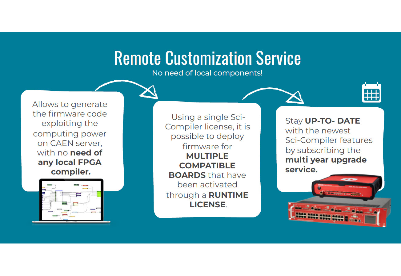 Sci(entific)-Compiler is an innovative software tool to program the Open FPGA of CAEN boards. It makes use of block diagrams instead of VHDL/Verilog firmware programming language to generate and compile a custom firmware, thus allowing to accelerate custom designs, even for non-expert FPGA users. Sci-Compiler is an automatic firmware generator that, starting from a graphical diagram, generates a firmware code that implements the required function. Moreover, Sci-Compiler is able to generate C++/Python example software code to be used in Windows and Linux for DAQ software implementation.
