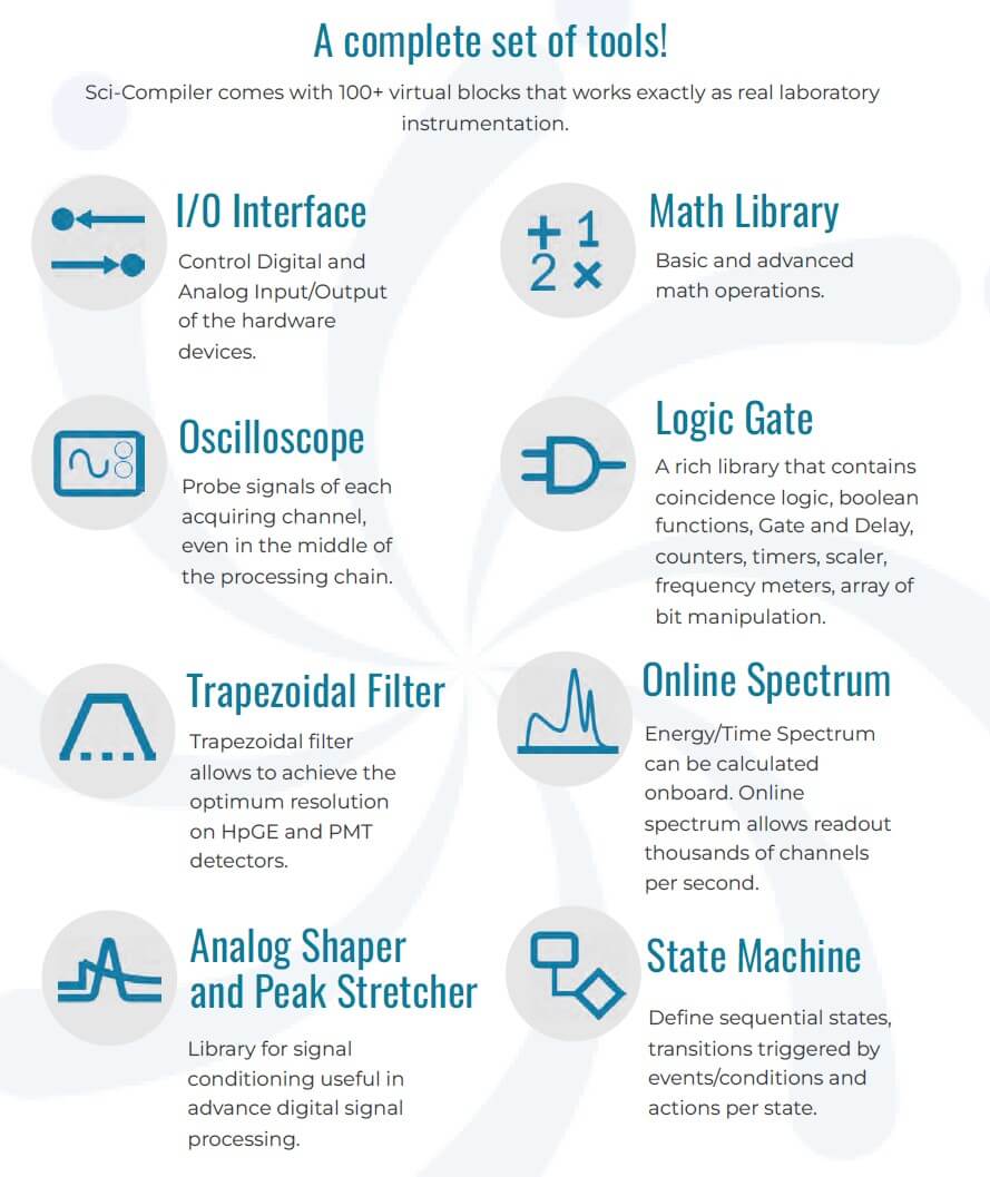 Sci-Compiler uses a prebuilt library set containing more than 100 blocks that implement complex function (MCA, Oscilloscope, Digitizer, TDC) commonly used in Physics applications.