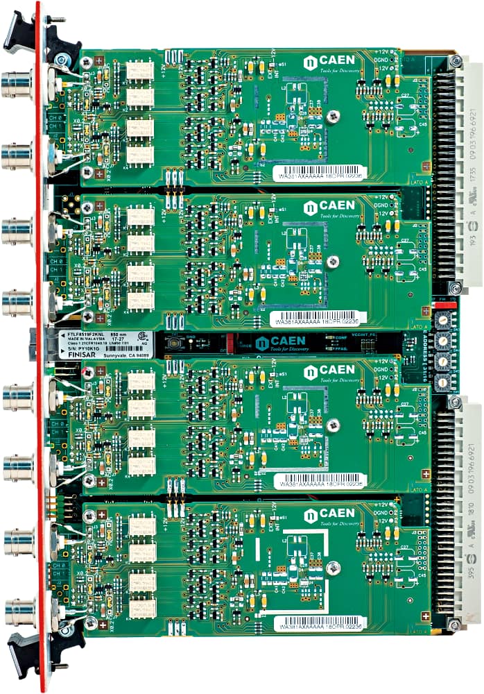 CAEN CONET proprietary protocol, Up to 80 MB/s transfer rate; Daisy chain capability by connecting up to 8 or 32 ADC modules to a single Optical Link Controller (A2818 or A3818 respectively)VME