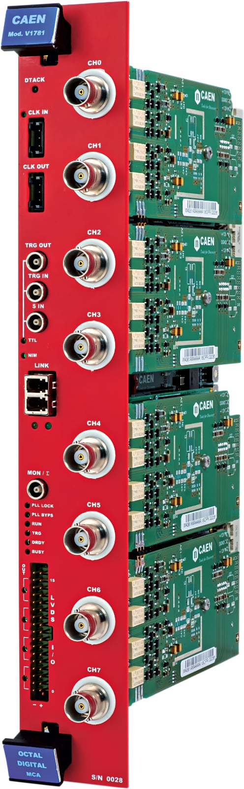 The V1781 is the new CAEN Octal 16k digital MCA. Designed for high energy resolution semiconductor detector is perfectly suited for those application in which the number of input channels start becoming relevant such as when segmented HPGe, Clovers and silicon detectors are involved.