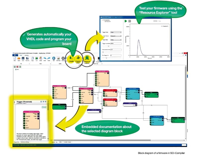 The 2740 digitizer family can be programmed throught the Sci-Compiler software for easy-FPGA programming. It is a block-diagram-based graphic tool, thought to help non-expert VHDL coders in building their own firmware.