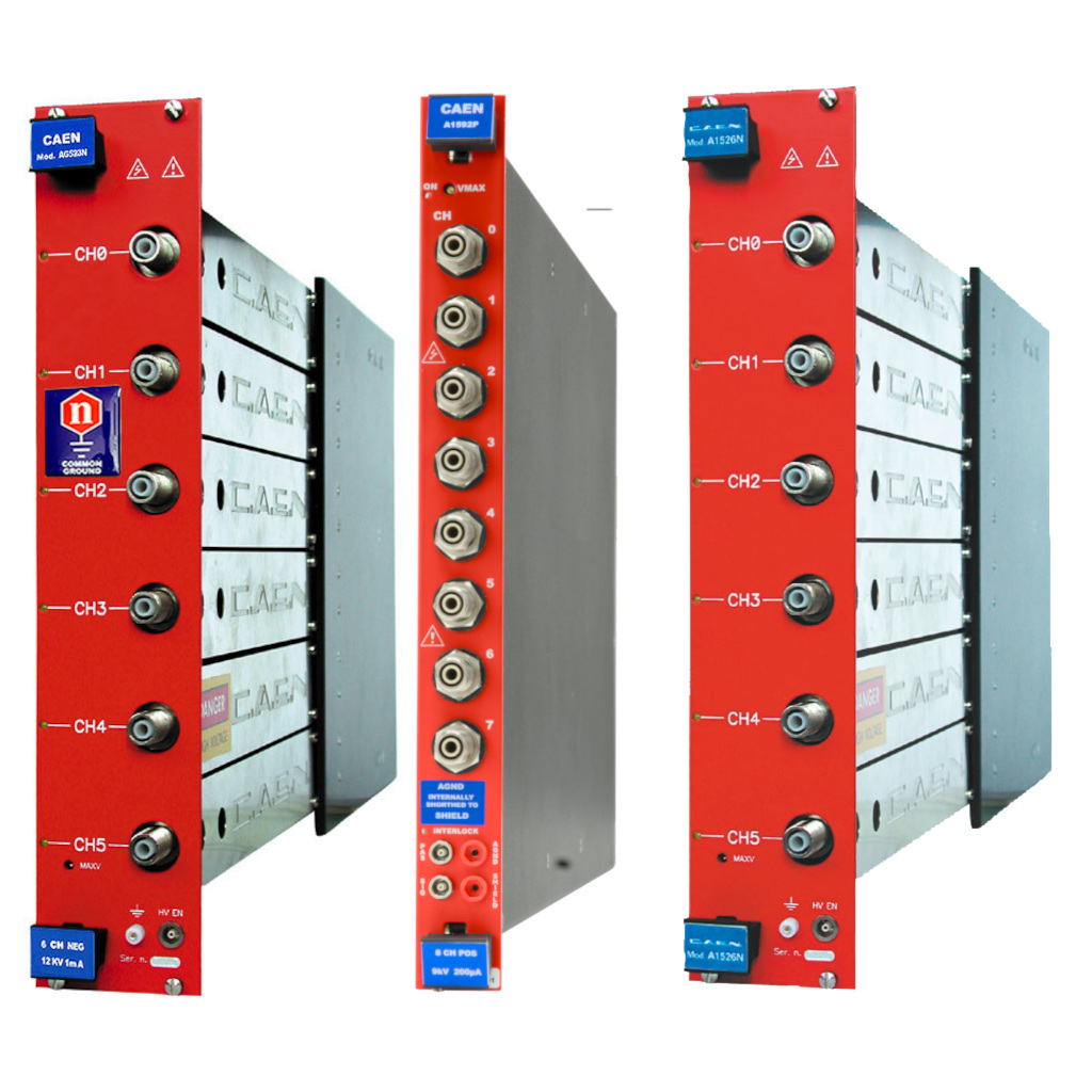 These models are double width (10 TE wide) boards that houses 6 independent high voltage channels, available with either positive, negative or mixed polarity (A1523 only). The output voltage can be programmed and monitored in the 0 ÷ 12 kV range with 1 V resolution. The maximum currents are: